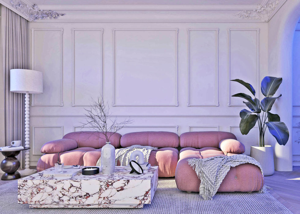 Η αντίθεση της μονοχρωμίας με την ένταση των χρωμάτων και υφών σε έπιπλα και διακοσμητικά αντικείμενα ενισχύει την οπτική δυναμική του χώρου.